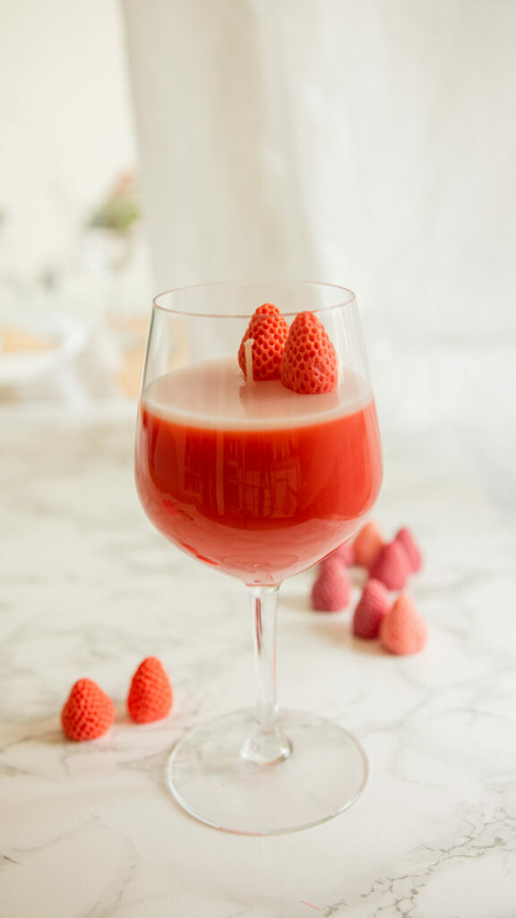 Nu kommer det sjove! Dekorer toppen med små jordbær af voks eller andre pynteting. Vi anbefaler dog ikke tørrede blomster til denne type lys – de kan risikere at brænde og skade glasset, især hvis du bruger tyndt glas som cocktailglas.